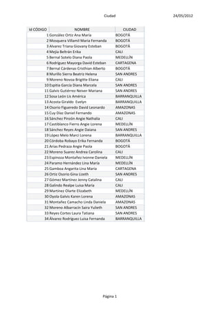 Este documento presenta una lista de 34 personas con sus respectivos códigos de identificación, nombres completos y ciudades de residencia. La mayoría de las personas en la lista residen en ciudades principales de Colombia como Bogotá, Medellín, Cali y Barranquilla.