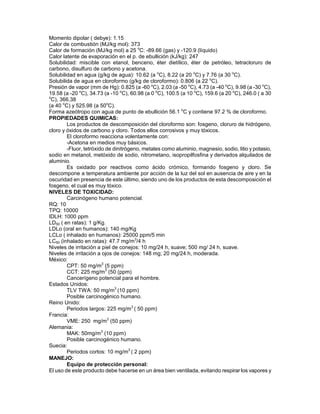 El documento proporciona información sobre el cloroformo, un líquido incoloro volátil utilizado como disolvente orgánico e intermediario en síntesis. Es moderadamente tóxico e irritante y se sospecha que es carcinogénico para humanos. Debe almacenarse lejos de la luz y manipularse con equipo de protección para evitar la inhalación de vapores o el contacto con la piel.