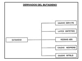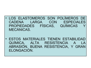 Este documento trata sobre elastómeros (cauchos sintéticos). Explica que los elastómeros son polímeros de cadena larga con propiedades físicas, químicas y mecánicas especiales como estabilidad química, resistencia a la abrasión y gran elongación. Luego describe los principales cauchos sintéticos como el SBR (estireno-butadieno), polibutadieno y neopreno, así como sus usos. Finalmente, explica el proceso de vulcanización mediante el cual se un