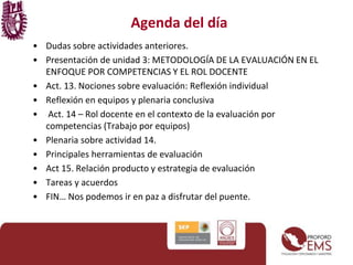 Este documento presenta la agenda y actividades de la 7a sesión de un diplomado sobre competencias docentes en el nivel medio superior. La sesión cubrirá la unidad 3 sobre metodología de evaluación con enfoque de competencias y el rol docente. Incluye actividades individuales y grupales sobre nociones de evaluación, tipos de evaluación, y el rol del docente en la evaluación por competencias. Finaliza con instrucciones sobre tareas a entregar antes de la próxima sesión.