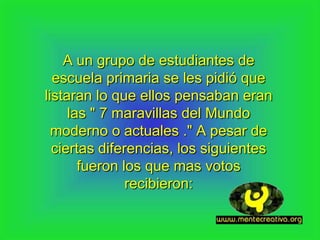 El documento lista las siete maravillas del mundo moderno según los votos de un grupo de estudiantes, incluyendo las Pirámides de Egipto, el Taj Mahal y la Gran Muralla China. Sin embargo, una niña sugirió que las verdaderas siete maravillas son los sentidos humanos como ver, oír, tocar, probar y amar, cosas que a menudo damos por sentado pero que son maravillosas.