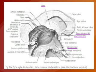 El documento describe la conformación externa e interna del mesencéfalo y diencéfalo. El mesencéfalo presenta colículos rostrales y caudales, y el acueducto mesencefálico. El diencéfalo contiene los tálamos, hipotálamo, glándula pineal, quiasma óptico y la cavidad del tercer ventrículo. Los tálamos están cubiertos por sustancia blanca y contienen grupos nucleares. El hipotálamo incluye el tubérculo cinereum y los tub