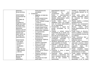 Este documento describe los objetivos y criterios de evaluación para la competencia de producir textos en inglés de forma escrita y oral. Incluye objetivos como reproducir frases simples en inglés, comprender ideas principales y detalles en textos complejos, leer textos técnicos en inglés, buscar información específica en documentos estructurados y comunicarse con fluidez sobre temas técnicos. Los criterios de evaluación incluyen dominio de aspectos gramaticales, tiempos verbales, vocabulario técnico y habilidades de lectura, es
