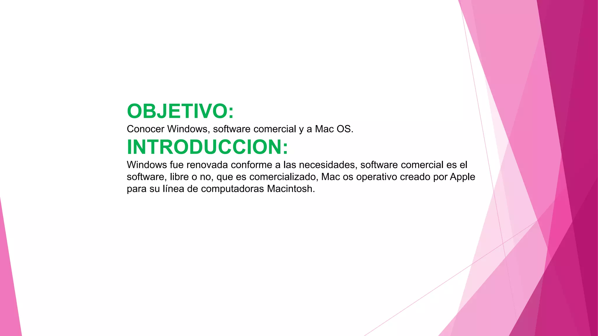 Windows ha tenido muchas versiones desde 1975 para satisfacer las necesidades cambiantes de los usuarios. El software comercial es software vendido que tiene un único propietario con derechos de autor. Mac OS fue el primer sistema operativo de Apple y tuvo éxito por su accesibilidad de precio, aunque tiene menos software disponible que Windows.