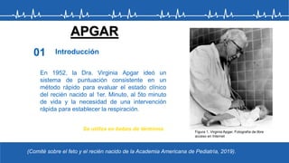 El documento describe el puntaje de Apgar, un método desarrollado por la Dra. Virginia Apgar para evaluar el estado de salud de los recién nacidos. Consiste en 5 componentes evaluados al 1er y 5to minuto después del nacimiento. Un puntaje bajo puede indicar depresión neonatal pero depende de factores como la edad gestacional y no predice resultados individuales. El puntaje de Apgar es útil para transmitir información general pero tiene limitaciones y no debe usarse solo para diagnosticar asfixia.