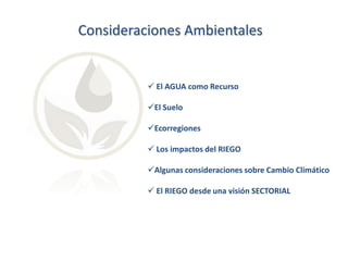 El documento analiza la identificación de áreas para el riego complementario en el noreste de Argentina, abordando consideraciones ambientales, la escasez de agua y la importancia de conservar este recurso ante el cambio climático. Se menciona que el uso ineficiente del riego provoca serios impactos ambientales, como la degradación del suelo y la contaminación del agua. Finalmente, se propone una visión sectorial que considere la evaluación ambiental estratégica para mitigar los efectos negativos y mejorar la planificación de proyectos de riego.