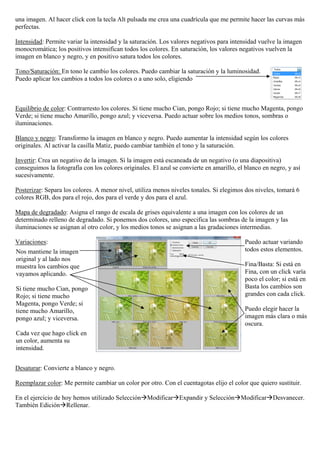 Este documento proporciona instrucciones sobre cómo realizar varias tareas de edición de imágenes en un programa de edición como cambiar el color de fondo, restaurar valores previos en diálogos, usar la varita mágica, ajustar propiedades de imagen como brillo y contraste, y colocar texto debajo de una imagen. También explica cómo usar herramientas como niveles, curvas, tono/saturación y equilibrio de color para realizar ajustes.