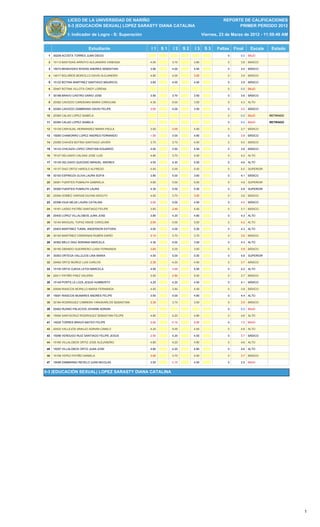 Este documento presenta el reporte de calificaciones del curso de Educación Sexual del Liceo de la Universidad de Nariño para el primer período de 2012. Contiene los nombres de los 47 estudiantes matriculados, sus calificaciones en tres indicadores diferentes, el promedio final y la escala de calificación alcanzada por cada uno.