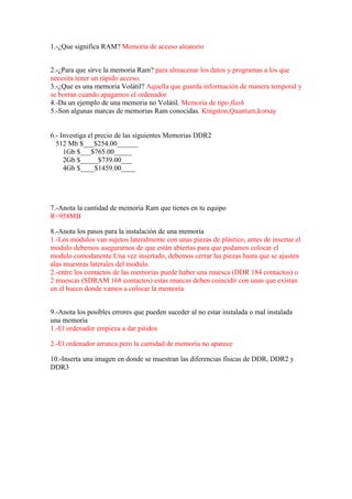 Este documento resume las características básicas de la memoria RAM. Explica que la RAM se usa para almacenar datos y programas de acceso rápido de forma temporal, mientras que la memoria flash es no volátil. También lista algunas marcas comunes de RAM como Kingston y Quantum, y los precios de memorias DDR2 de diferentes capacidades. Finalmente, detalla los pasos para instalar correctamente una memoria RAM y posibles errores que pueden ocurrir si no se instala bien.
