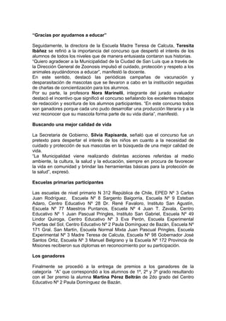 El documento resume un evento en el que se entregaron premios a estudiantes por su participación en un concurso literario sobre mascotas. Se entregaron diplomas a 20 escuelas participantes y a los 3 mejores trabajos de cada categoría. También se informa sobre la colocación de ornamentos navideños y la realización de operativos de limpieza en dos barrios.
