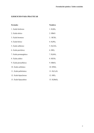 El documento proporciona una lista de ácidos oxoácidos y sus fórmulas químicas, así como ejercicios para practicar la formulación y nombrado de estos ácidos. Además, ofrece reglas generales para formular y nombrar ácidos oxoácidos dependiendo de la valencia del elemento no metálico.
