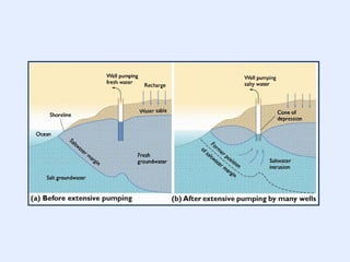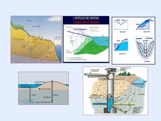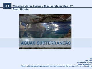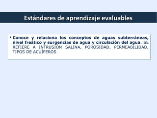 El documento trata sobre las aguas subterráneas. Explica que las aguas subterráneas se forman cuando el agua de lluvia se infiltra en el suelo hasta llegar a una capa impermeable, acumulándose y formando un acuífero. También describe los diferentes tipos de acuíferos como los acuíferos libres, confinados y semiconfinados, así como los conceptos de porosidad, permeabilidad, nivel freático y zonas de saturación y aireación. Además, explica cómo se