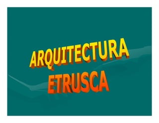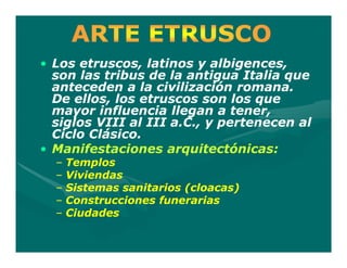 Los etruscos vivieron en la antigua región de Etruria en Italia entre los siglos VIII y IV a.C. y tuvieron una gran influencia en la civilización romana. Desarrollaron la arquitectura civil con construcciones como viviendas, sistemas sanitarios y ciudades amuralladas. Su arquitectura religiosa incluía templos cuadrangulares con cellas y columnas, que influyeron en el posterior desarrollo arquitectónico de Roma.