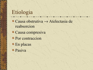 La atelectasia es la reducción del contenido de aire y pérdida de función en un área pulmonar, causada por obstrucción, compresión o reabsorción. Puede provocar disturbios en la ventilación/perfusión pulmonar, dificultad para la difusión de oxígeno e hipoxemia. Los signos incluyen aumento de la frecuencia respiratoria, crepitantes en el pulmón afectado, disminución de la expansión pulmonar y desviación de la tráquea.