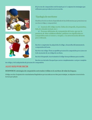 El documento describe cómo se aprende a escribir. Explica que la competencia escrita se refiere al código escrito o conocimientos lingüísticos abstractos, mientras que la composición se refiere a las estrategias para producir textos escritos. Además, clasifica a los escritores en cuatro tipos dependiendo de si dominan el código escrito, los procesos de composición, o ambos: escritor competente, escritor sin código, escritor bloqueado y escritor no iniciado.