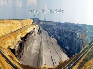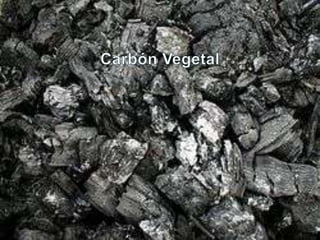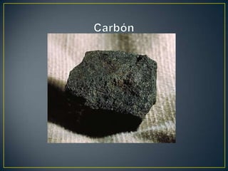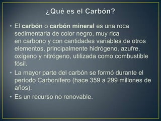 El documento describe el carbón, una roca sedimentaria negra rica en carbono que se forma a partir de la descomposición de vegetales. Explica que el carbón se originó principalmente durante el período Carbonífero y que es un recurso no renovable. Además, detalla sus usos principales como generador de energía eléctrica y en la industria del acero, así como sus ventajas de ser barato y estar cerca de donde se extrae, pero también sus desventajas ambientales y de seguridad en las minas.