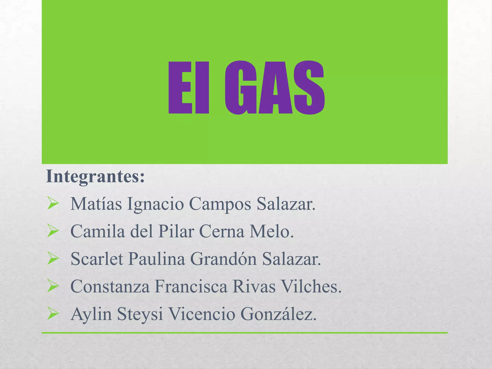 El documento presenta información sobre el gas natural y los diferentes tipos de gases. Identifica a los integrantes del GAS y explica que el gas natural es una mezcla de gases que se origina de la materia orgánica depositada en el subsuelo. Luego describe diferentes tipos de gases según su tratamiento y utilización, incluyendo gases inflamables, licuados, comprimidos, tóxicos, oxidantes, corrosivos y criogénicos. Finalmente, brinda detalles sobre la obtención del gas natural y su composición principal de metano.
