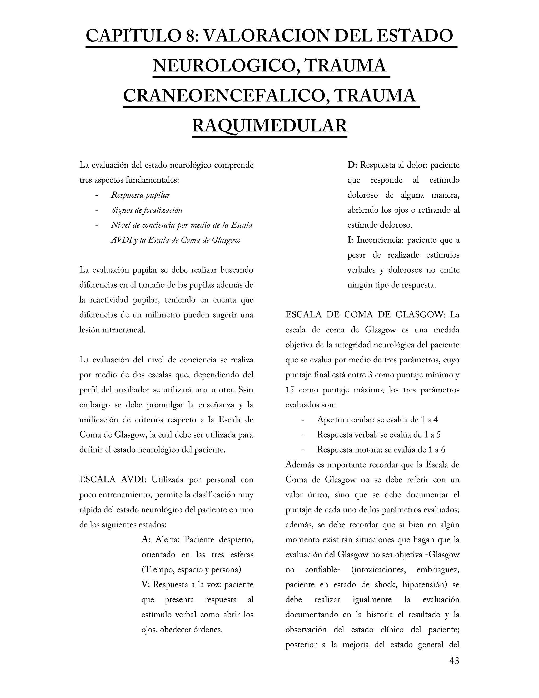 El documento describe la evaluación del estado neurológico de pacientes con trauma, incluyendo la evaluación de la conciencia mediante las escalas AVDI y Glasgow, la evaluación de pupilas, y la detección de signos de focalización. También describe el manejo inicial de pacientes con trauma craneoencefálico (TCE), incluyendo la estabilización, el uso de hiperventilación terapéutica ante signos de herniación, y los criterios para tomografía cerebral.