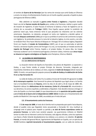 El documento resume la crisis del Antiguo Régimen en España y el inicio de la Guerra de Independencia contra Francia. Carlos IV asumió el trono en 1788, pero la Revolución Francesa de 1789 complicó su reinado. La invasión de Portugal y la derrota naval en Trafalgar debilitaron a España. En 1808, Napoleón forzó las abdicaciones de Carlos IV y su hijo Fernando VII y colocó a su hermano José Bonaparte en el trono español, lo que provocó el levantamiento popular del 2 de mayo en Madrid y el inicio de