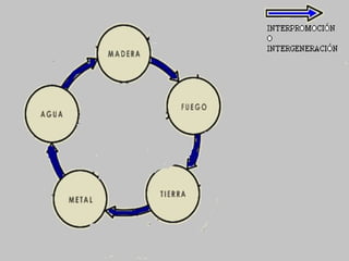 La doctrina de los cinco elementos de la medicina tradicional china sostiene que todas las cosas están compuestas por madera, fuego, tierra, metal y agua. Explica que el desarrollo y cambio de las cosas resulta de la interacción y movimiento de estos elementos. Además, clasifica las cosas y fenómenos según sus características y explica los mecanismos de regulación normal y anormal entre los elementos.