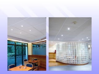 El documento describe los diferentes tipos de cielos falsos, sus materiales, características e instalación. Menciona cielos tradicionales de madera, yeso y cartón, así como cielos modulares con placas desmontables de yeso, fibra de vidrio u otros materiales. Explica los requisitos de la estructura soporte, colocación de planchas y accesorios para cada solución.