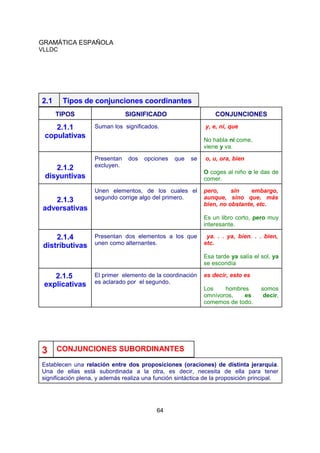El documento habla sobre las conjunciones en español. Explica que las conjunciones unen palabras u oraciones sin afectar su significado. Distingue entre conjunciones coordinantes, que unen elementos del mismo nivel, y conjunciones subordinantes, que unen oraciones de distinta jerarquía. Enumera los tipos de conjunciones coordinantes y subordinantes, dando ejemplos de cada una. Finalmente, propone ejercicios para identificar y clasificar conjunciones en oraciones.