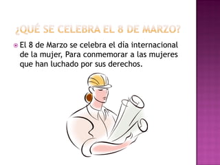 El 8 de marzo se celebra el Día Internacional de la Mujer para conmemorar a las mujeres que lucharon por sus derechos y por la igualdad de género en la sociedad, en especial a aquellas que murieron en un incendio en una fábrica en 1925, lo que obligó al gobierno a cambiar las leyes laborales para proteger a las trabajadoras. La fecha también busca reconocer la participación de la mujer en pie de igualdad con el hombre y su desarrollo pleno como personas.