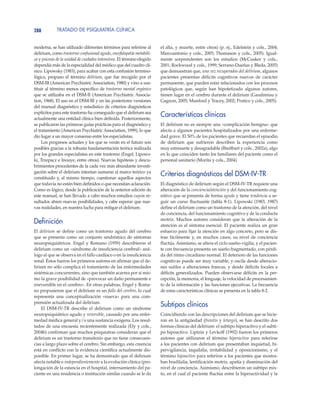 El documento describe el delirium, la demencia y otros trastornos cognitivos. Explica que estos trastornos comparten alteraciones estructurales y funcionales del cerebro como causa primaria. Además, los factores psicológicos desempeñan un papel importante en cómo el paciente experimenta los síntomas. El documento también discute la definición, características clínicas, subtipos, criterios de diagnóstico y etiopatogenia del delirium. Finalmente, enfatiza la importancia del enfoque biopsicosocial