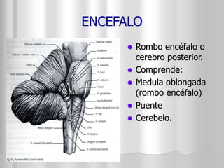 El documento describe la anatomía del encéfalo y sus principales componentes. El encéfalo está compuesto por el cerebro, cerebelo y tronco encefálico. El tronco encefálico incluye la médula oblongada (bulbo raquídeo), puente y cerebelo. Se describen las caras, surcos y estructuras internas de cada una de estas regiones del encéfalo.