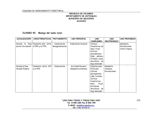 El documento presenta el componente rural del esquema de ordenamiento territorial del municipio de Heliconia, Antioquia. Describe las áreas de conservación, exposición a amenazas, sistemas de servicios públicos y disposición de residuos, y producción agropecuaria, forestal y minera. Incluye un cuadro con las características, tratamientos recomendados, usos principales, complementarios, restringidos y prohibidos para diferentes zonas rurales. Recomienda restricciones para la minería, preservación de áreas sobre 2,400 m
