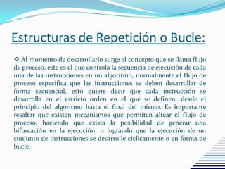 Este documento habla sobre las estructuras de repetición o bucles en programación de computadoras. Explica que las estructuras repetitivas permiten alterar el flujo secuencial normal de un algoritmo para ejecutar un conjunto de instrucciones de forma cíclica. Menciona tres tipos principales de estructuras repetitivas: mientras que, hacer mientras que y para. También provee un ejemplo de bucle controlado por contador que ejecuta un bloque de sentencias un número específico de veces usando índices y parámetros.