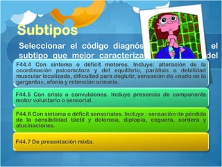 El documento proporciona información sobre el trastorno de conversión. Describe los diferentes subtipos de síntomas que pueden presentarse, incluyendo síntomas motores, crisis, convulsiones y síntomas sensoriales. También discute factores como la prevalencia, curso, síntomas asociados y criterios diagnósticos.