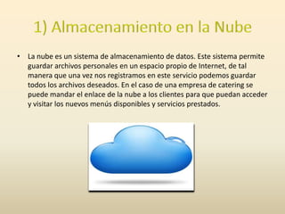 Este documento describe 8 herramientas de la Web 2.0 que pueden ser útiles para una empresa de catering, incluyendo la nube para almacenar y compartir archivos; Slideshare y Prezi para presentaciones; páginas web para almacenar y compartir fotos de platos; podcasts para difundir contenido multimedia; Evernote para organización; Netvibes como escritorio virtual; Gmail y Maps de Google; y Moodle para formación online.