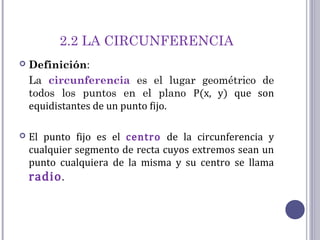 Este documento proporciona una definición de circunferencia como el lugar geométrico de todos los puntos equidistantes de un punto fijo llamado centro. Explica que la ecuación de una circunferencia depende de las coordenadas de su centro y la longitud de su radio. Además, presenta ejemplos numéricos para ilustrar cómo encontrar la ecuación de una circunferencia dados estos parámetros y revisa la forma general de la ecuación de una circunferencia.