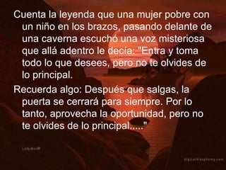 La historia cuenta de una mujer pobre que entró a una cueva mágica donde podía tomar todas las riquezas que quisiera por ocho minutos. Fascinada por el oro, dejó a su hijo para agarrar más tesoros. Cuando se acabó el tiempo, la puerta se cerró y se dio cuenta que su hijo estaba adentro. Al igual, las personas tienen unos 80 años en la tierra para vivir y una voz les advierte no olvidarse de lo principal como la familia y amigos, pero se enfocan en las ganancias materiales. Al final, solo qu