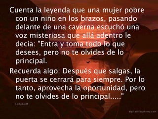 La historia cuenta de una mujer pobre que entra a una cueva mágica donde puede tomar todas las riquezas que desee, pero solo tiene ocho minutos. Fascinada por el oro, deja a su hijo para agarrar tesoros. Cuando se acaban los ocho minutos, sale corriendo de la cueva con sus tesoros pero se da cuenta que dejó a su hijo adentro para siempre. La historia enseña que en la vida solo tenemos poco tiempo y que lo más importante son los valores espirituales y las relaciones, no los placeres materiales.