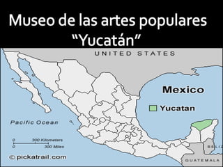 El documento describe varios museos en México, incluyendo el Museo del Vidrio en Monterrey, el cual exhibe piezas de vidrio prehispánico, colonial y contemporáneo; el Museo de la Ciudad de Chetumal en Quintana Roo, el cual presenta la historia y vida cotidiana de la ciudad; y el Museo Nacional de Arte Popular en la Ciudad de México, el cual promueve las expresiones culturales de las etnias mexicanas.
