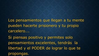Este documento presenta 8 pensamientos positivos para lograr el éxito. Estos incluyen ser una persona positiva con confianza en uno mismo, creer que puedes lograr todo con la ayuda de Dios, no tener miedo porque Dios te ama y protege, vivir en el presente aprovechando cada momento, ser disciplinado terminando lo que empiezas con excelencia, tener paz en la mente y en armonía con los demás, y poner a Dios en primer lugar confiando en sus promesas.