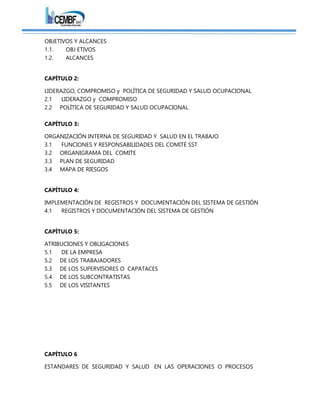 Este documento presenta el Reglamento Interno de Seguridad y Salud en el Trabajo de la empresa CEMBF SAC. Establece como objetivos mantener el bienestar de los colaboradores y eliminar malas prácticas a través del cumplimiento de normas. Designa responsables de seguridad y salud ocupacional y establece comités de seguridad. Detalla políticas, funciones, obligaciones y estándares de seguridad para proteger a los trabajadores.