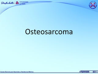 Este documento resume información sobre dos tipos de sarcomas: osteosarcoma y sarcoma de Ewing. El osteosarcoma es el tumor maligno óseo más frecuente en niños y adolescentes, con un pico de incidencia entre los 10-15 años. Se asocia con factores de crecimiento rápido. El tratamiento incluye quimioterapia neoadyuvante, cirugía y quimioterapia coadyuvante. El sarcoma de Ewing es la segunda causa de tumores óseos malignos en niños, que afecta principal