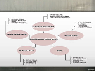 El documento presenta un resumen histórico y conceptual de la fenomenología. Comienza contextualizando el surgimiento del movimiento filosófico en los siglos XVIII-XX, destacando las influencias de pensadores como Lambert, Brentano y Husserl. Luego describe brevemente las principales corrientes y autores asociados a la fenomenología y ciencias del espíritu, como Dilthey, Weber, Schütz, Heidegger y Berger y Luckmann. Finalmente, se enfoca en explicar los conceptos y método centrales de la fenomenología de