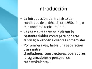La introducción del transistor en la década de 1950 permitió la fabricación y venta de computadores comerciales fiables. Los primeros sistemas operativos usaban procesamiento por lotes donde los programas se agrupaban y ejecutaban de forma automática. También se desarrollaron los primeros lenguajes de alto nivel como FORTRAN y ALGOL para facilitar la programación.