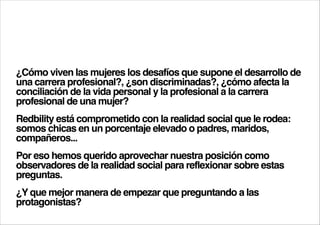 El documento analiza los desafíos que enfrentan las mujeres en el ámbito laboral, incluyendo discriminación de género y la dificultad de conciliar vida personal y profesional. A través de un estudio con dos grupos de mujeres profesionales, se revelan estadísticas sobre discriminación laboral, perfil demográfico y opiniones sobre políticas de discriminación positiva. Las conclusiones indican que una de cada dos mujeres ha experimentado discriminación y que las que más luchan por conciliar son aquellas en puestos de alta responsabilidad.