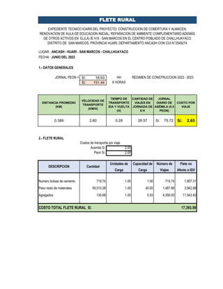 Este documento presenta los costos de transporte rural (flete) para un proyecto de construcción en Challhuayaco, Perú. Detalla el salario diario de peones y asémilas, así como la distancia, velocidad y tiempo de viaje promedio. Luego enumera los materiales a transportar, el número de viajes requeridos y el costo por viaje. El costo total estimado del flete rural para el proyecto es de 17,393.59 soles.