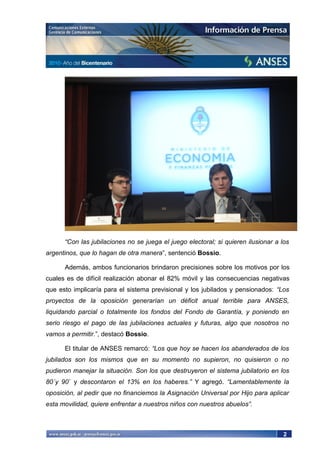 El Director Ejecutivo de ANSES cuestionó fuertemente a la oposición por proponer proyectos "poco serios" e "impracticables" para aplicar el 82% móvil a los haberes jubilatorios. Estos proyectos generarían un déficit anual que pondría en riesgo el pago de las jubilaciones actuales y futuras. Bossio defendió la política de inclusión social llevada a cabo desde 2003 y criticó a la oposición por querer enfrentar a niños con abuelos.