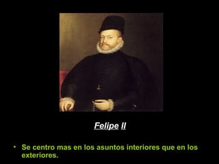 Felipe II centró sus esfuerzos en los asuntos internos más que en los externos. Estableció Madrid como capital y fortaleció el poder real manteniendo el imperio con un modelo centralizado y burocrático. Tuvo problemas internos como la represión de los moriscos y la muerte de su hijo Carlos. Logró victorias externas como la Batalla de San Quintín contra los franceses y la Batalla de Lepanto contra los turcos, pero sufrió derrotas como la Armada Invencible contra los ingleses. Su mayor triunfo fue anexionar Portugal a