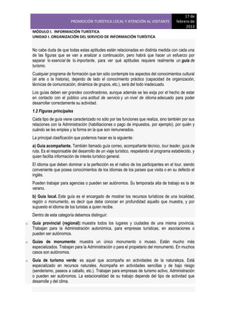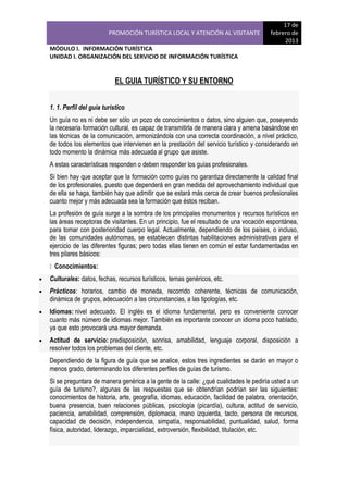 Este documento describe las cualidades y roles de diferentes tipos de guías turísticos. Explica que un guía debe tener sólidos conocimientos culturales y prácticos, así como habilidades de comunicación para transmitir información de manera clara y entretenida. Describe varias figuras principales de guías, incluyendo guías acompañantes, guías locales, transferistas y asistentes en destino. También proporciona un decálogo con consejos para realizar visitas guiadas efectivas, como hablar de forma enérgica, contar historias interesantes,