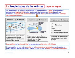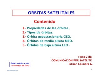 Este documento describe diferentes tipos de órbitas satelitales. Explica las órbitas geoestacionarias (GEO), órbitas de media altura (MEO) como el sistema GPS, y órbitas de baja altura (LEO) como el sistema Iridium. También describe las propiedades de las órbitas, incluyendo las leyes de Kepler, y cómo se usan satélites en diferentes órbitas para comunicaciones y navegación global.