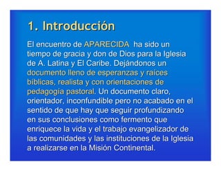 Este documento describe la opción pastoral de Aparecida de ser discípulos misioneros al servicio de la vida. Enfatiza la necesidad de un encuentro personal con Jesucristo que conduzca a la conversión, y propone una pedagogía pastoral centrada en la formación de discípulos a través de la lectura bíblica, la catequesis y el acompañamiento espiritual, con el fin de promover una misión continental que defienda la dignidad de toda vida humana.