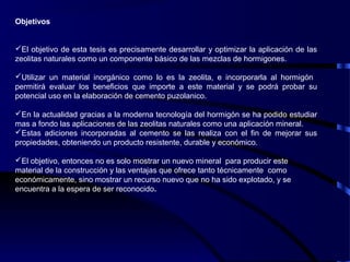 Este documento presenta la tesis de grado de Carlos Saltos Arteaga sobre los efectos de la adición de zeolita en las propiedades mecánicas de un hormigón convencional de cemento Portland tipo I. El objetivo es desarrollar y optimizar el uso de zeolitas naturales como componente básico en mezclas de hormigón. Se realizaron pruebas en hormigón fresco y endurecido con diferentes porcentajes de zeolita, midiendo propiedades como revenimiento, peso volumétrico, contenido de aire, velocidad ultrasón